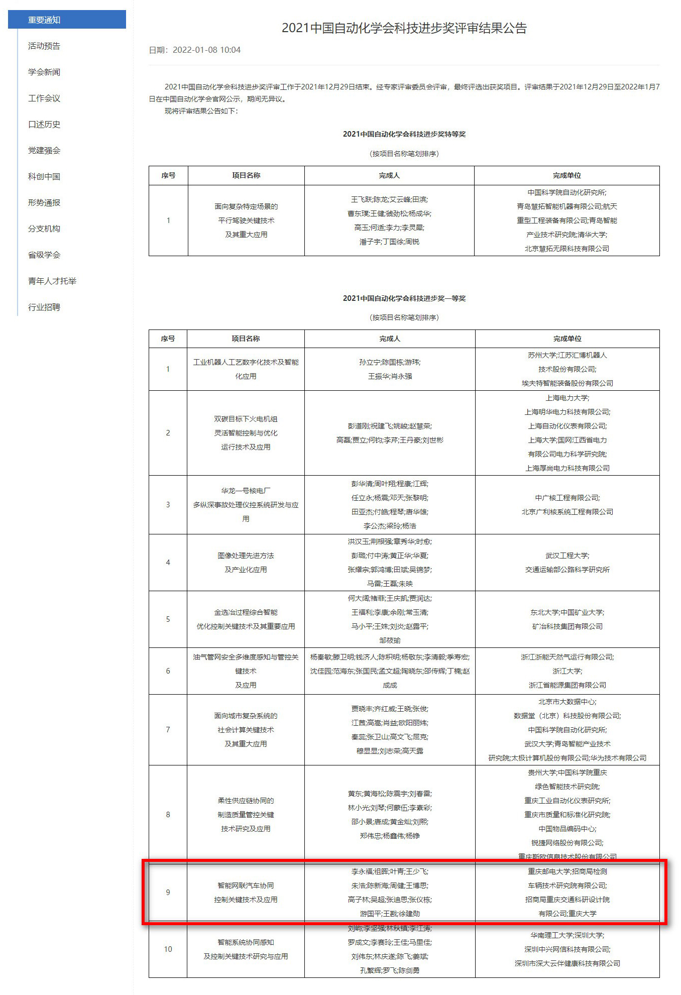 近日,招商局检测车辆技术研究院有限公司(简称招商车研)参与研究的《智能网联汽车协同控制关键技术及应用》项目获得2021中国自动化学会科技进步奖一等奖。