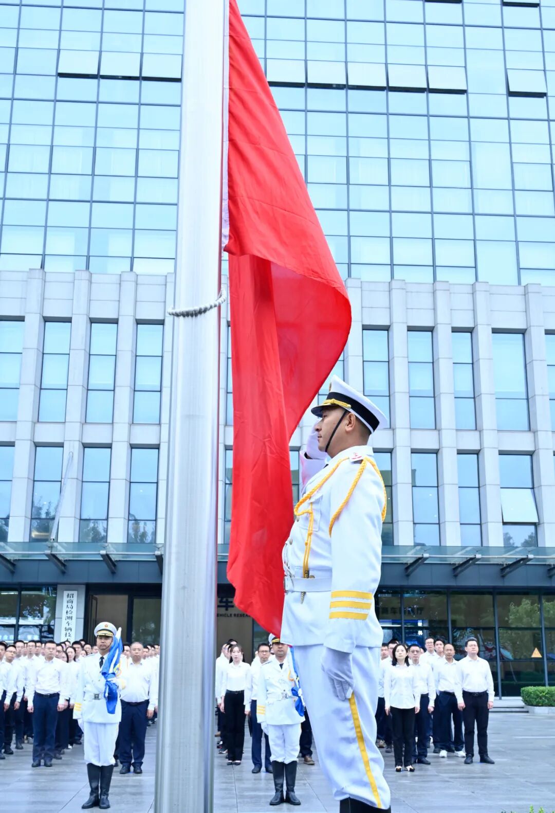 在国歌与招商局之歌激昂的旋律中,鲜艳的五星红旗及招商局集团司旗依次缓缓升起,于秋季的清风中徐徐招展。升旗手们身姿挺拔、精神抖擞,迈着铿锵有力的步伐完成升旗仪式;现场全体干部员工整齐肃立,目光紧紧追随旗帜,致以崇高的注目礼。
