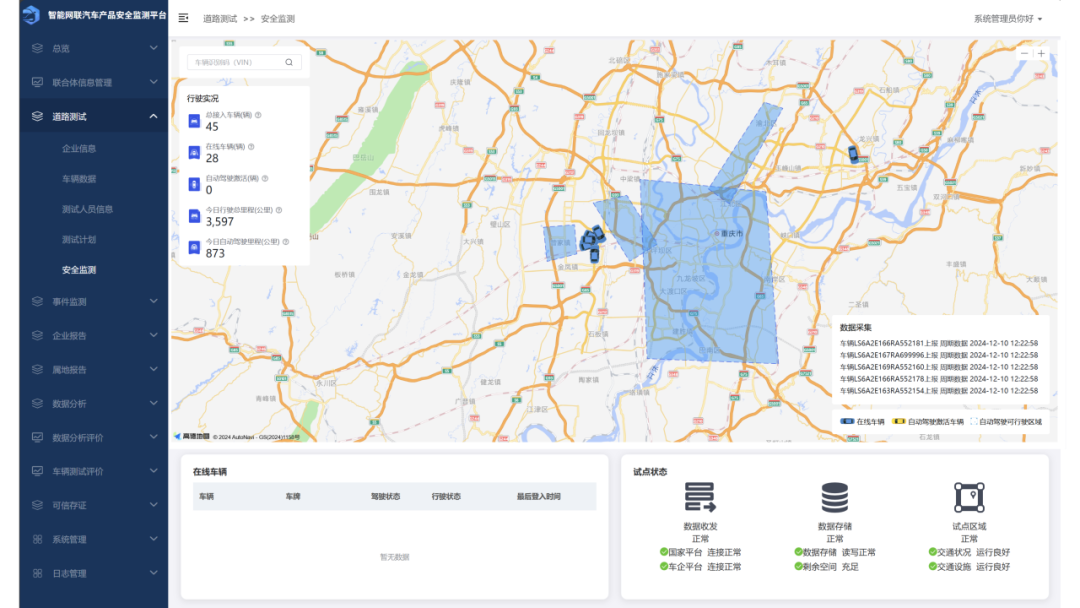 招商车研建设了重庆智能网联汽车产品安全监测属地平台,根据L3准入试点的要求,为在重庆自动驾驶公开道路运行的试点车辆提供全生命周期产品安全监测服务。实时采集车辆位置、运动状态、自动驾驶系统状态、行车环境等高频周期性数据,以及碰撞和有碰撞风险事件、自动驾驶系统激活与退出事件、失效事件、汽车网络与数据安全事件、OTA事件、远程控制等事件触发类数据,累计监管里程达60万公里,为试点车型自动驾驶功能的充分验证和残余风险评估提供关键性数据支撑。