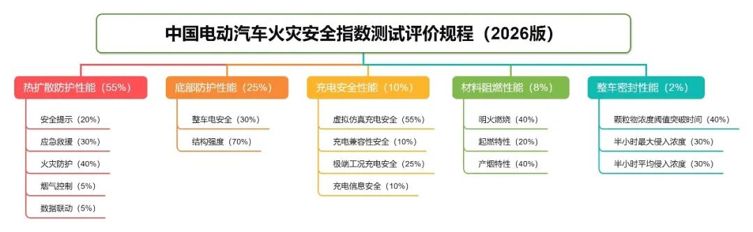 其中,《测试评价规程(2026版)》以“整车全场景安全”为核心,覆盖材料阻燃性能、充电安全性能、底部防护性能、热扩散防护性能及整车密封性能五大测试评价规程(详见附件)。为实现精准量化评估,规程进一步细化形成17项二级指标、43项三级指标及63项评价内容,从核心部件到整车系统,全方位系统评估电动汽车火灾安全性能。