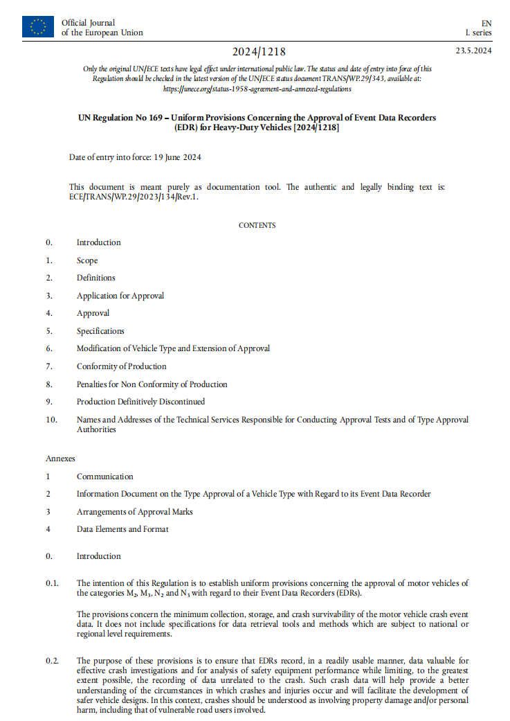 根据欧盟最新规定,自2026年1月7日起,新认证的M2、M3、N2、N3类商用车辆必须满足UN R167(直接视野)与UN R169(事件数据记录系统EDR)两项强制性法规要求,方可进入欧盟地区进行新车销售。因此,UN R167/R169两项法规已成为中国商用车进入欧洲市场不可或缺的“技术护照”与“准入基石”。